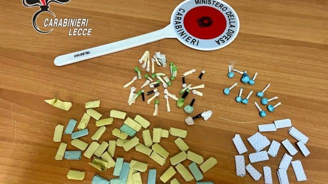 Insieme al brindisino è stato tratto in arresto un operaio casertano di 22 anni, trovato in possesso di 27 dosi di sostanza presumibilmente stupefacente del tipo “MDMA” e di 4 dosi di cocaina, per un peso complessivo di grammi 6, nonché della somma in contanti di 320 euro.