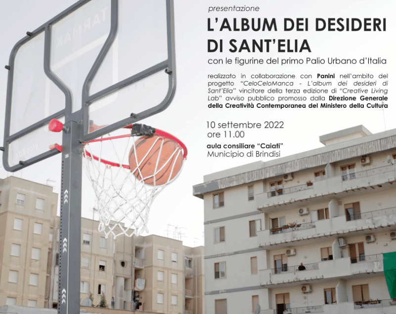 Sarà il coronamento del progetto, il primo nato in Puglia, denominato “CeloCeloManca, l’album dei desideri di Sant’Elia”, vincitore della terza edizione di “Creative Living Lab”, l’avviso pubblico promosso dalla direzione generale Creatività Contemporanea del ministero della Cultura, realizzato dal Collettivo ImmaginAbile e con la progettazione grafica di PazLab, in collaborazione con Arca Nord Salento, Comune di Brindisi, dei volontari della cooperativa Legami di Comunità di Brindisi, Molo12, FabLab di Palazzo Guerrieri Brindisi e, come si diceva, la Panini Figurine.