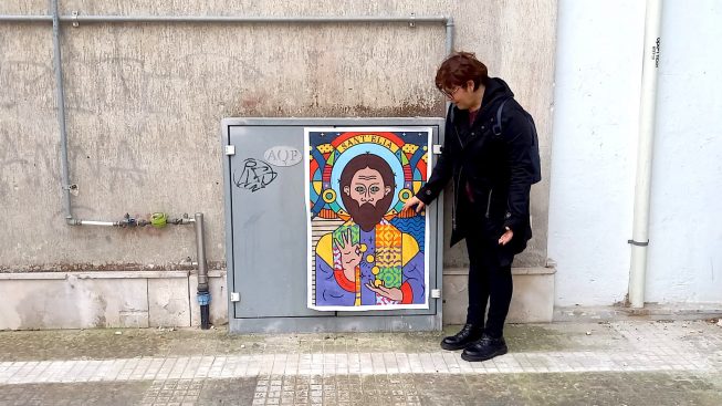 Scendono in campo tutte le agenzie educative del segmento urbano in oggetto: ci sono le associazioni di volontariato, quelle sportive, le scuole e le parrocchie, ma la mentalità non è pervenuta; e manca il fascino che la magia sollecita, per questo si è reso necessario introdurre un elemento che crei la suggestione dell’intervento che cala dalla volta celeste. Il santo che non esiste, ma che in qualche modo è in cielo, in terra e in ogni strada di quello che è ormai il suo quartiere, con tanto di stampa di santini e manifesti sparsi un po’ dappertutto. Sì perché questo Sant’Elia tatuato e profano non abita le edicole votive e, nottetempo, fa tacchinaggio cosicché la mattina successiva lo si trova che spunta su un cancello, sulla facciata di un palazzo, alla fermata dell’autobus o sulla centralina del gas all’angolo di un marciapiede, ad accogliere le preoccupazioni e i sogni del commerciante, della casalinga, dell’operaio, della mamma, del professionista, del giovane disoccupato. Ma lui tiene a precisare che la sua figura in realtà “non è salvifica ma ispiratrice, è del quartiere ma ha girato il mondo, è ospitale ma ama farsi ospitare, dice le cose come stanno ma la sua caratteristica principale è che non fa miracoli ma è in grado di fare in modo che accadano, perché la santità non è un lusso per pochi e tutti sono chiamati a essere santi (cfr. Madre Teresa di Calcutta)”