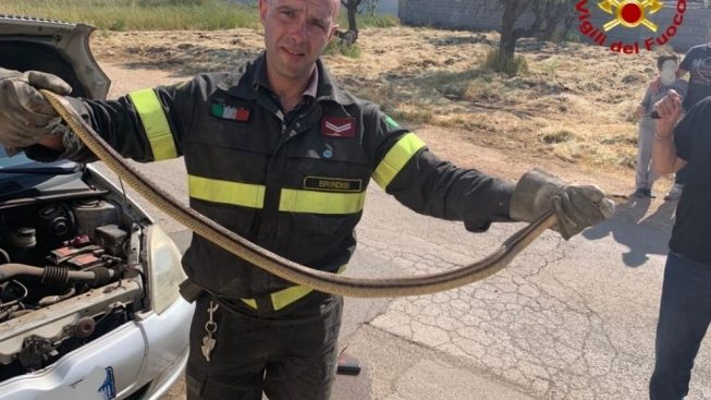 Una squadra del Comando Provinciale vigili del fuoco di Brindisi è intervenuta a San Vito dei Normanni per il recupero di un grosso rettile di circa un metro e mezzo che si era rifugiato nel motore di un’autovettura. Allertati dalla proprietaria dell’auto i vigili del fuoco hanno liberato il serpente Cervone, assolutamente innocuo, e successivamente lo hanno rilasciato in aperta campagna.