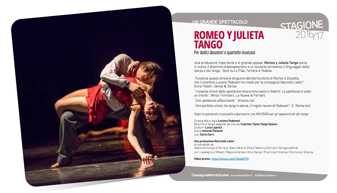 Lo spettacolo, ideato e realizzato dal regista e coreografo Luciano Padovani per la Compagnia Naturalis Labor di Vicenza, è ispirato al celebre dramma d’amore shakespeariano e fonde in modo originale la danza contemporanea con il tango per raccontare.In scena un cast di dodici tangueros argentini e di giovani artisti italiani sapientemente affiancati e sostenuti dalla musica del celebre Tango Spleen Cuarteto, che esegue celeberrime musiche di Piazzolla, Speranza, Calo, Mores, Quartango. I costumi portano la firma di Lucia Lapolla, le scene sono di Antonio Panzuto, le luci di Carlo Cerri.