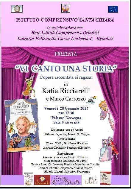 Il soprano Katia Ricciarelli ha scritto, insieme con Marco Carrozzo, un libro per ragazzi ‘Vi canto una storià in cui attraverso il racconto di «fiabe speciali», ossia di sei opere liriche più famose e certamente più adatte a giovani spettatori, intende avvicinare un pubblico sempre più ampio, a cominciare appunto da quello giovanile, al mondo musicale operistico. Ne dà notizia un comunicato. Il volume sarà presentato a Brindisi venerdì 20 gennaio nella sala Università di Palazzo Granafei – Nervegna per iniziativa dell’Istituto Comprensivo «Santa Chiara», in collaborazione con la Rete degli Istituti Comprensivi e la libreria «Feltrinelli Point» di Brindisi.
