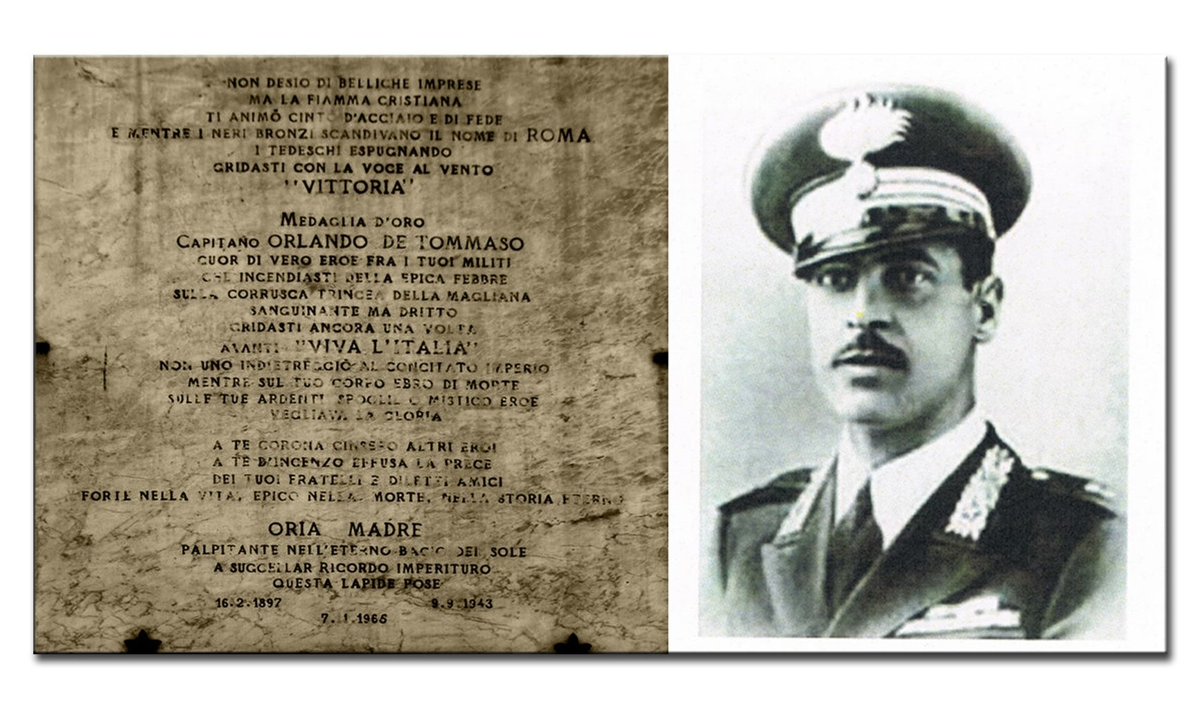 Nei giorni concitatissimi del settembre 1943, il Capitano dei carabinieri, Orlando De Tommaso comandava la 4a Compagnia del II Battaglione allievi CC di stanza a Roma. Il giorno dopo l’armistizio, il 9 settembre, mentre il re, il presidente del Consiglio, i ministri fuggivano da Roma per rifugiarsi a Brindisi, i deboli reparti dei “Granatieri di Sardegna” contrastavano paracadutisti tedeschi alla periferia della Capitale, la 4a Compagnia CC fu mandata di rinforzo alla Magliana. De Tommaso cadde alla testa dei suoi uomini, nel vano tentativo di fermare l’avanzata tedesca verso Roma. La massima ricompensa al valore, è stata conferita all’ufficiale con questa motivazione: “Comandante di compagnia allievi carabinieri impegnata per la difesa della capitale, nella riconquista di importante caposaldo che truppe tedesche avevano strappato dopo sanguinosa lotta a reparto di altra arma, mosse all’attacco con slancio superbo, trasfondendo nei suoi giovanissimi gregari grande entusiasmo ed alto spirito combattivo. Dopo tre ore di aspra ed alterna lotta, in un momento decisivo delle sorti del combattimento, per trascinare il suo reparto inchiodato dal fuoco nemico a poche centinaia di metri dall’obiettivo e lanciarlo contro l’ultimo ostacolo, non esitava a balzare in piedi allo scoperto, sulla strada furiosamente battuta, affrontando coscientemente il supremo sacrificio. Colpito a morte da una raffica di arma automatica, cadeva gridando ai suoi carabinieri: “Avanti! Viva l’Italia”. Il suo grido e il suo olocausto, galvanizzando il reparto, lo portarono d’impeto, in una nobile gara di eroismi, alla riconquista dell’obiettivo”.