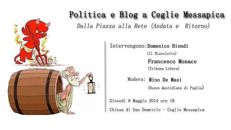 Si parlerà di politica e internet giovedì 8 maggio alle ore 19 a Ceglie Messapica. “Dalla piazza alla rete (andata e ritorno)” è il titolo scelto dai blogger cegliesi Domenico Biondi e Francesco Monaco, gestori rispettivamente dei blog “Il Diavoletto” e “Tribuna Libera” per racchiudere il senso di un incontro con i cittadini nato per discutere insieme di quello che è ormai un fenomeno virale nel dibattito politico cegliese: il ruolo e il successo sempre crescente di uno strumento tecnologicamente innovativo, i blog, che, giorno per giorno, si occupano di raccontare e prendere posizione sui tanti aspetti della vita della comunità cittadina.