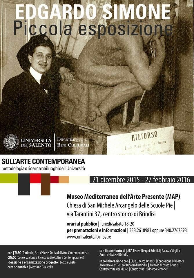 Avviandosi l’ultima settimana espositiva della mostra “Edgardo Simone. Piccola Esposizione”, dedicata alle opere dello scultore brindisino, allestita nei suggestivi spazi del MAP della chiesa delle Scuole Pie, per oggi sabato 20 febbraio alle ore 18,30 è prevista una visita guidata condotta dal prof. Massimo Guastella  La mostra, la prima che si tiene nella città natale dove l’artista nacque nel 1890, ha riscosso negli ultimi due mesi un notevole successo di pubblico, con positivi attestati di critica, ma soprattutto con larga e interessata partecipazione delle scolaresche.   Guastella, che è il curatore della mostra, illustrerà le fasi salienti della vita artistica di Simone sino alla morte avvenuta a Hollywood nel 1948, con riferimento alle ventitre sculturine in bronzo, terracotta e ceramica, alla pittura ad olio, ai documenti e agli articoli ordinati, presso il MAP di Brindisi, in Via Tarantini 37, dove è prevista la proiezione di un video documentario su Edgardo Simone.