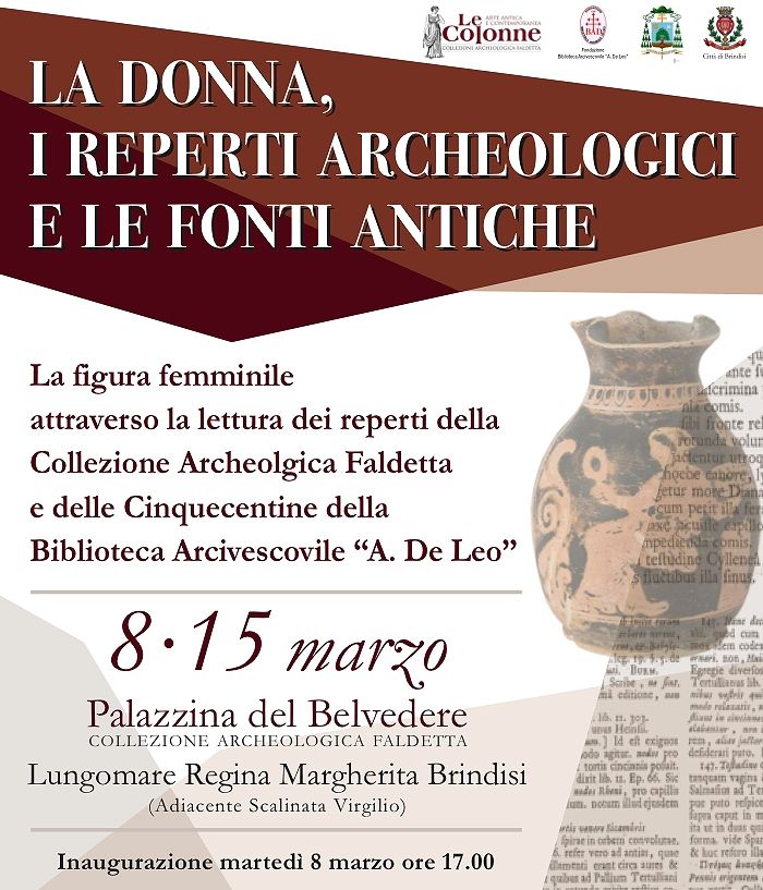 Martedì 8 marzo, alle ore 17, presso la Palazzina del Belvedere, adiacente alla Scalinata Virgilio, si terrà l’inaugurazione della mostra “La donna, i reperti archeologici e le fonti antiche”. Un percorso diacronico ideato per ripercorrere la quotidianità delle donne nel mondo antico, attraverso la lettura dei reperti archeologici, strettamente legati al mondo femminile, della Collezione Archeologica Faldetta e delle fonti storiche. Preziose Cinquecentine, Giovenale, Marziale, Ovidio, Properzio, Plinio, Valerio Massimo, usciranno dai locali della Biblioteca Pubblica Arcivescovile “A. De Leo” e verranno esposte nelle sale museali. Da un’attenta analisi dell’iconografia femminile degli oggetti antichi e delle fonti latine sarà possibile notare che l’universo maschile e quello femminile percorrono strade parallele, destinate ad ambiti profondamente diversi: da una parte, il fragore della guerra, i sussurri dell’intrigo politico, le trattative per gestire denaro e potere, la pluralità delle voci di poeti, oratori e scrittori, dall’altra la quiete della casa, il mutismo dell’obbedienza, il monotono rumore di fusi e telai e il silenzio dell’ignoranza. La mostra, con il patrocinio morale del Comune di Brindisi e dall’Arcidiocesi di Brindisi-Ostuni, sarà curata dalla dott.ssa Katiuscia Di Rocco, direttrice Biblioteca Arcivescovile “De Leo”, e dott.ssa Anna Cinti, Presidente della Associazione Le Colonne, con la collaborazione della dott.ssa Laura Santovito, archeologa.