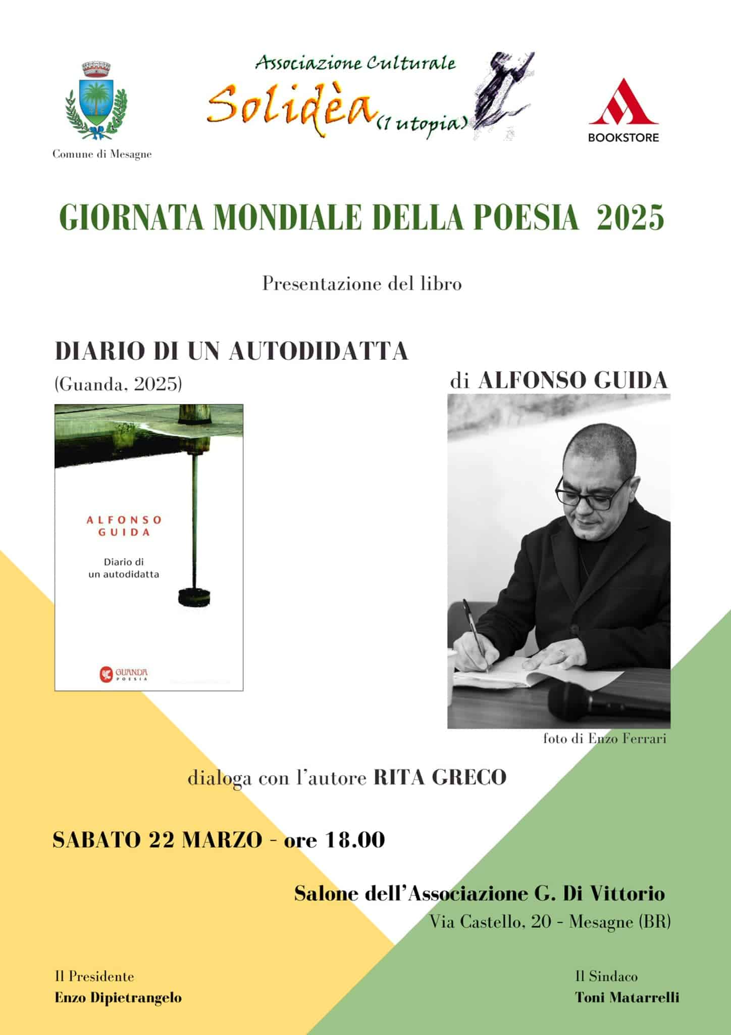Sabato 22 marzo, alle ore 18, presso il Salone dell’associazione Giuseppe Di Vittorio, in via Castello, a Mesagne, l’associazione culturale Solidea (1 Utopia) OdV celebra la Giornata Mondiale della Poesia, ricorrenza istituita dalla XXX Sessione della Conferenza Generale Unesco nel 1999 e celebrata per la prima volta il 21 marzo dell’anno successivo: ospite della manifestazione sarà il poeta Alfonso Guida, di San Mauro Forte (Matera), che presenterà la sua ultima silloge “Diario di un autodidatta” (Guanda, 2025).