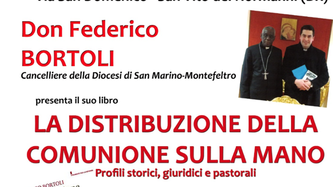 Giovedì 13 febbraio, alle ore 18,00 presso la sala conferenze della Biblioteca Comunale di San Vito dei Normanni don Federico Bortoli, Cancelliere della Diocesi di San Marino-Montefeltro, presenterà il suo libro “La distribuzione della Comunione sulla mano”, impreziosito dalla prefazione del Card. Robert Sarah, Prefetto della Congregazione per il Culto Divino e la Disciplina dei Sacramenti.