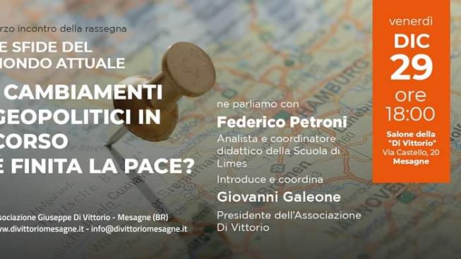 Terzo appuntamento, presso il salone dell’associazione Di Vittorio (in via Castello, n. 20 a Mesagne), con la rassegna culturale “Le sfide del mondo attuale”: venerdì dicembre 2023 alle ore 18 sarà ospite Federico Petroni, analista e coordinatore didattico della Scuola della rivista di geopolitica Limes. La conferenza, dal titolo “Cambiamenti geopolitici in corso. È finita la pace?” sarà introdotta dal presidente dell’associazione, il dottor Giovanni Galeone, e analizzerà i nuovi scenari e i possibili equilibri che si stanno delineando tra le potenze mondiali e quale ruolo possono avere le opinioni pubbliche per bloccare la deriva della guerra. Partendo dalla guerra in Ucraina, per arrivare all’attacco terroristico di Hamas e al genocidio dell’intero popolo palestinese a Gaza, passando dalle decine di altre guerre altrettanto sanguinose ma sostanzialmente ignorate, Petroni racconterà quella che Papa Francesco ha definito “la terza guerra mondiale a pezzi”.