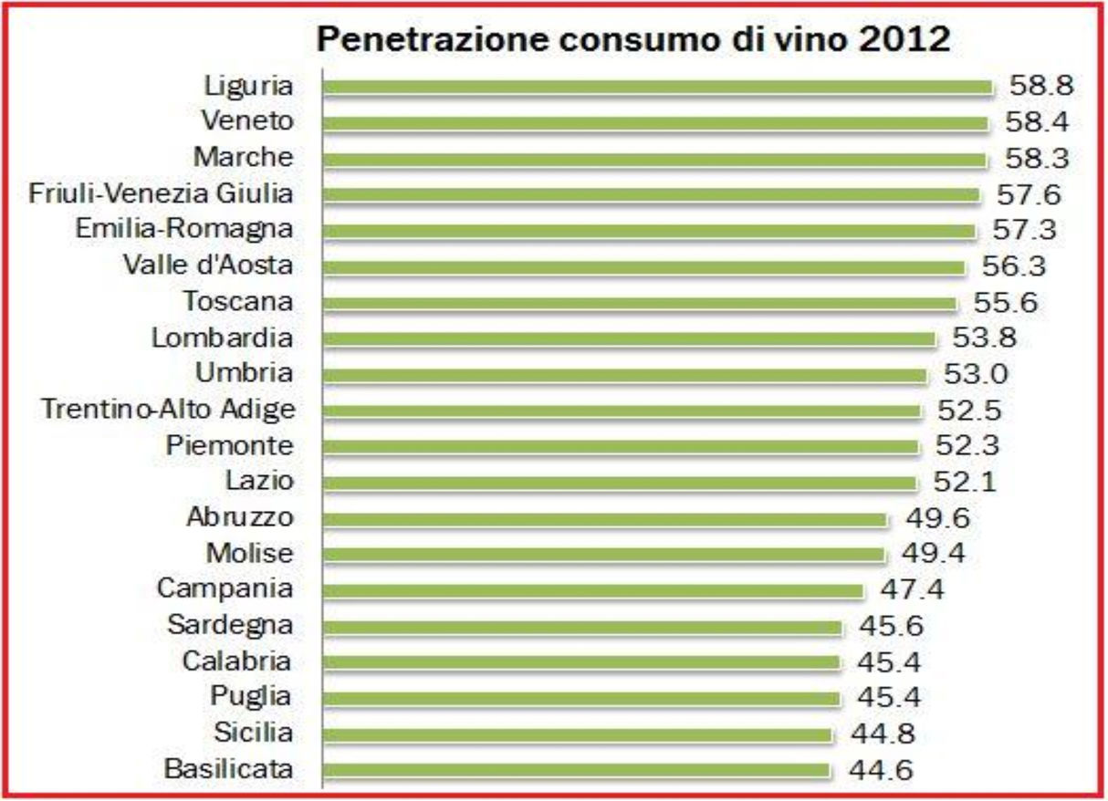 É infatti statisticamente provato che il consumo di vino é inversamente proporzionale alla ricchezza di una determinata regione: in Italia, per un PIL pro capite per regione indicizzato di 20, la penetrazione dell´uso abituale del vino é del 48%, mentre ad un PIL pro capite di 30 la percentuale d´uso di vino sale al 55%. Tra il 2007 ed il 2012 la popolazione bevitrice abituale di vino in Puglia si é ridotta dell´11% mentre nel Veneto si é incrementata dell´1%.