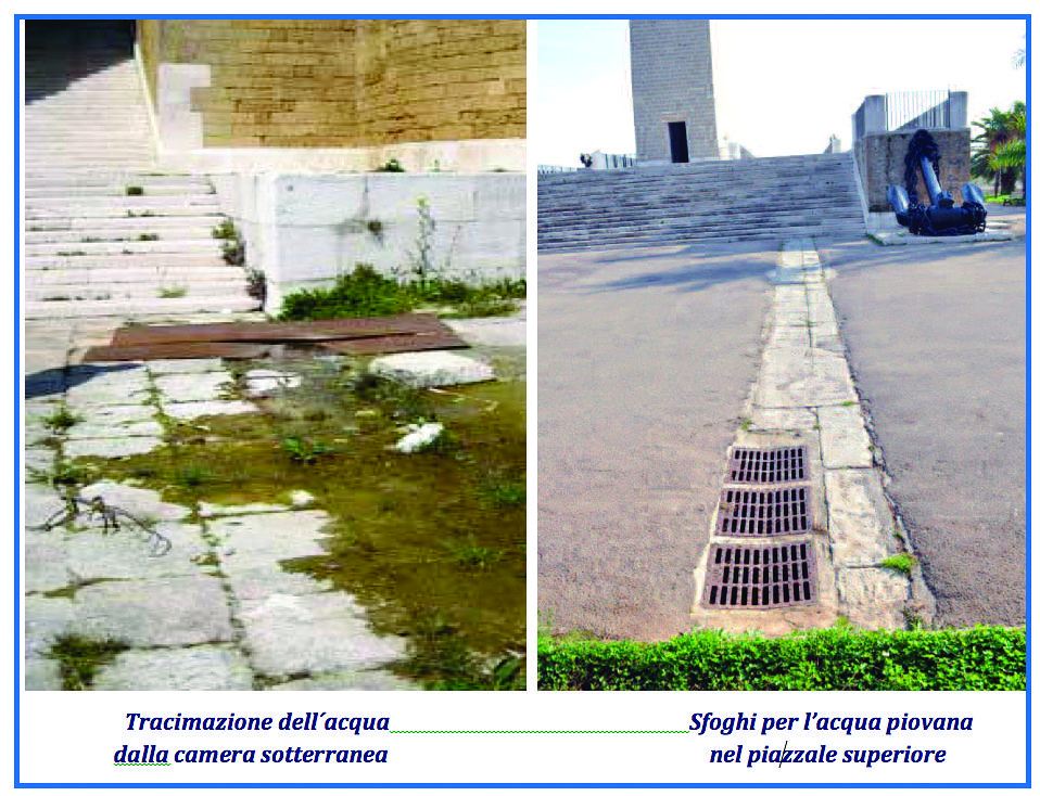Il 1 febbraio 2012 Senzacolonne pubblicò un ampio e documentato articolo che illustrava e anzi denunciava il deterioro strutturale di una parte delle fondazioni del monumento e dei muri di contenimento adiacenti alla scalinata, conseguenza di un evidente disfunzionamento del sistema di drenaggio del piazzale superiore e di quello inferiore. Ebbene tutte le autorità contattate a seguito della pubblicazione di quell`articolo si mostrarono, a parole, assolutamente disposte ad intervenire per diagnosticare e risolvere il problema, ma nei fatti nessuna autorità in più di due anni è intervenuta ed il problema, lungi dall`essere stato corretto, continua intatto a minare da sottoterra la sicurezza strutturale del Monumento.