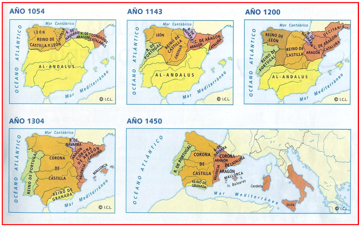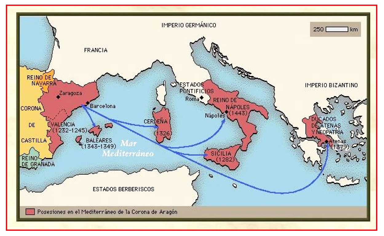Quindi, la corona d’Aragona si estese oltremare, conquistando le Baleari con il re Giacomo I (1213-1276), la Sicilia con il re Pietro III (1276-1285), la Sardegna con il re Giacomo II (1291-1327), i ducati di Atene e Neopatria con il re Pietro IV (1336-1387) e il regno di Napoli con il re Alfonso V (1416-1458).