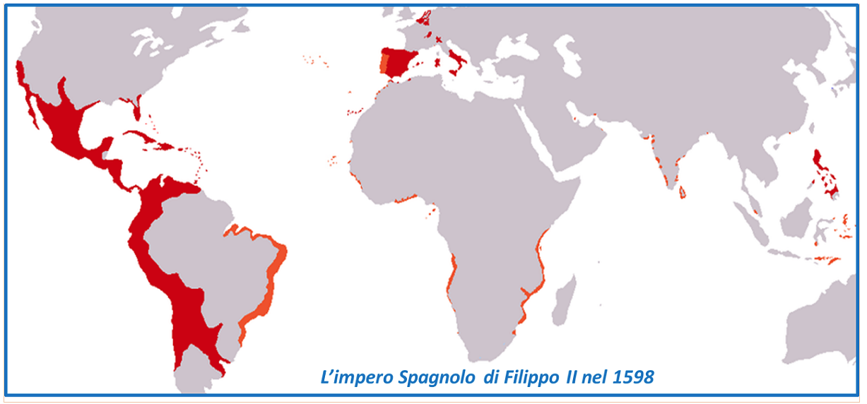 In seguito, un altro re spagnolo divenne imperatore, questa volta però dell’impero di Spagna: Filippo II (1527-1598), il figlio di Carlo V che salì sul trono di Spagna nel 1556 inaugurando il cosiddetto secolo d’oro spagnolo. I suoi possedimenti si estesero a tutto il Meridione italiano, alla Sicilia, alla Sardegna, al ducato di Milano; quindi alla Contea Franca, ai Paesi Bassi e ai vastissimi possedimenti d’America cui si aggiunsero le isole Filippine e, dal 1581, al Portogallo con tutti i relativi grandi possedimenti d’oltremare: il Brasile, le Indie Orientali e le basi commerciali in Africa e Asia.