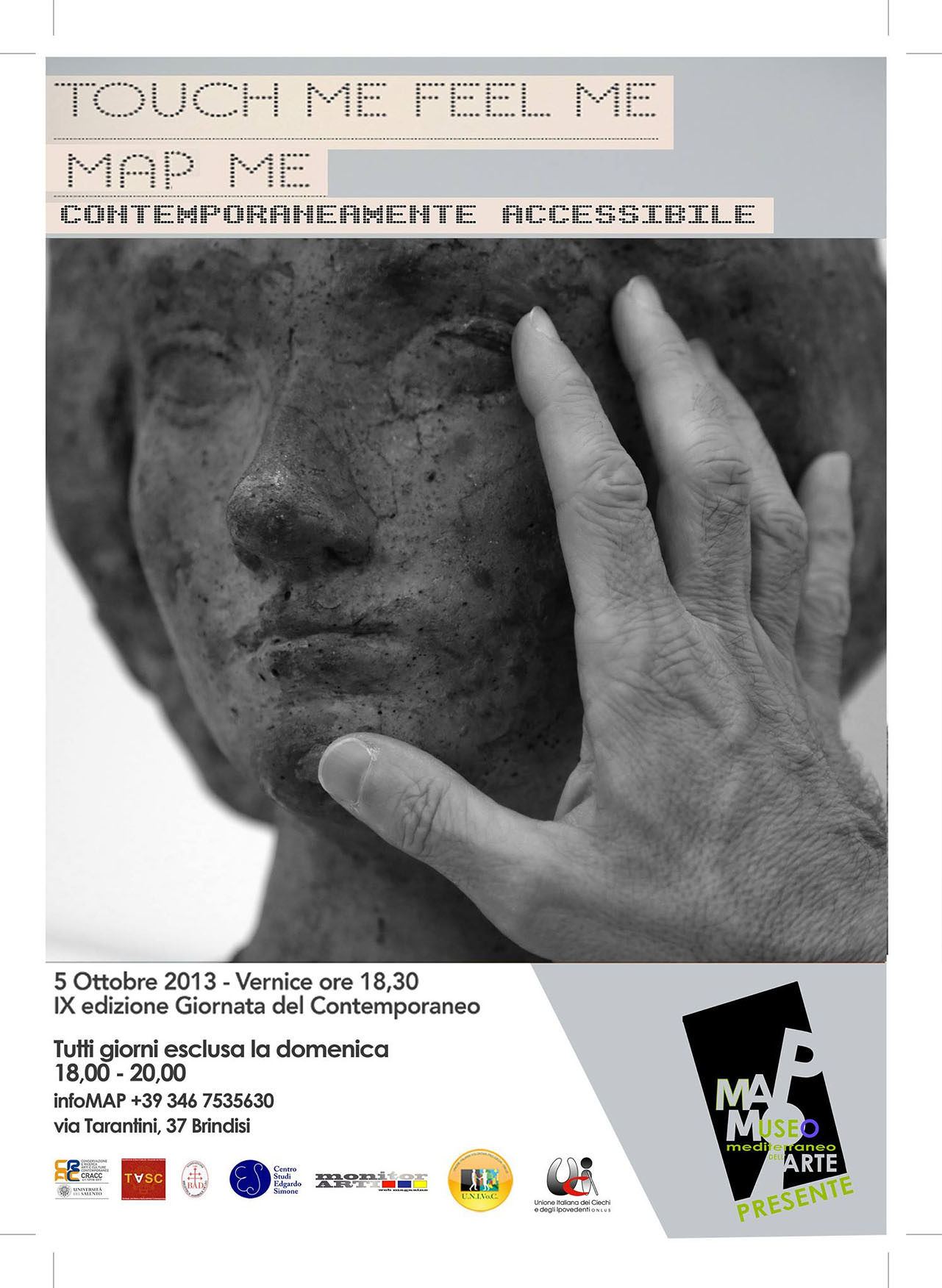 A Brindisi, il MAP (Museo Mediterraneo dell’Arte Presente, istituito da CRACC srl Spin off dell’Università del Salento) presenta sabato 5 ottobre 2013 il progetto “Touch me, feel me, map me: contemporaneamente accessibile”. (al sofisticato palato dei lettori di questo blog non sarà sfuggita l’eco che il titolo del progetto rimanda all’album “Tommy” degli WHO, datato 1969 – http://it.m.wikipedia.org/wiki/Tommy_%28album%29 – e da cui Ken Russell ha tratto l’omonimo film nel 1975 – http://it.m.wikipedia.org/wiki/Tommy_%28film%29 -) Toccami, percepiscimi, elaborami sono i tre concetti sviluppati dal protagonista della storia che dopo aver subìto violenze, si è auto inflitto il riparo nel mutismo, nella sordità, nella cecità. Ai cultori della musica degli WHO suggerisco la visione e l’ascolto del brano See Me, Feel Me all’indirizzo – http://www.youtube.com/watch?v=PHUjOwn660c&desktop_uri=%2Fwatch%3Fv%3DPHUjOwn660c&app=desktop -. La similitudine con la condizione assai diffusa della clandestinità di fin troppe identità è più che ampiamente servita. Toccare, percepire, elaborare, tre azioni dal gusto e dal significato intimo che sprofondano nell’identità della persona, nel suo vissuto da cui si partono i recettori dei significati. Dal variegato, sorprendete personalissimo percorso di digestione culturale, riemergono alla superficie delle relazioni trans personali, il complesso sistema di contributi sensoriali propedeutici ad ogni progresso, umano, sociale, culturale, economico. Il progetto, che si inserisce a pieno titolo fra le primissime iniziative nel suo genere “potenzia la fruibilità e accessibilità all’arte contemporanea – sottolinea in una nota il gruppo di lavoro del MAP, guidato dal direttore scientifico, prof. Massimo Guastella – dotando la collezione permanente del “Simposio della Scultura”, composta da una quarantine di opere a conformazione tridimensionale del Map, di didascalie elaborate in braille”. L’idea nasce da Vincenzo Luperto, non vedente, laureando in storia dell’arte e da Antonietta Argentiero tutor dell’allievo per i servizi integrativi di accessibilità allo studio dell’UNISALENTO.