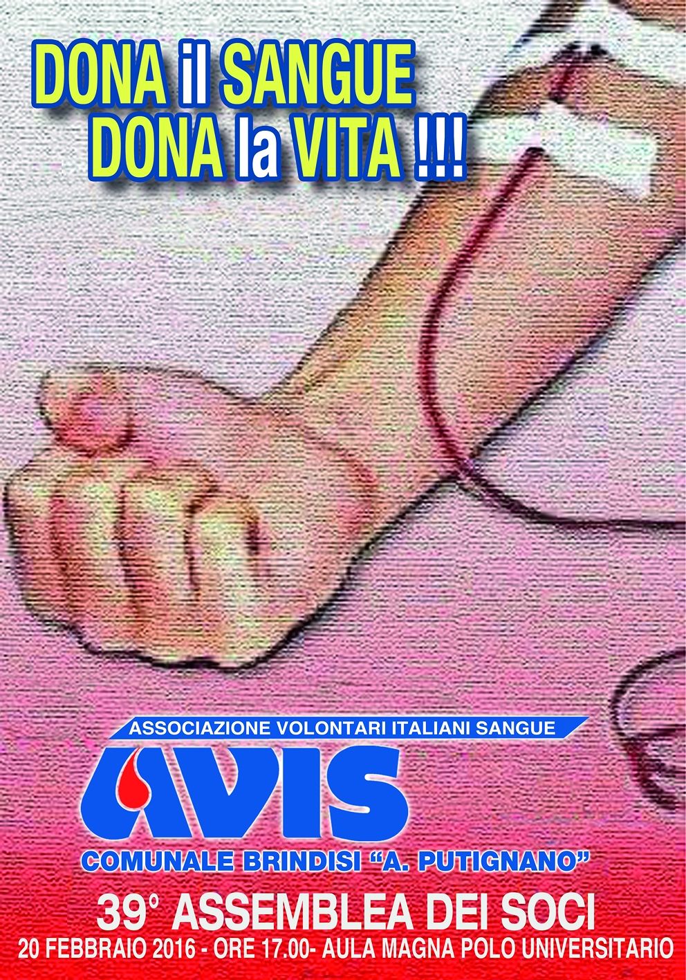 Sabato 20 febbraio, alle ore 17, presso l’aula magna del polo universitario (ex ospedale “Di Summa”), si terrà la 39° Assemblea ordinaria dei Soci dell’Avis Comunale di Brindisi. Sarà un motivo di confronto tra i soci ed i vertici associativi, si ascolterà la relazione del Presidente della sezione e si approveranno il bilancio consuntivo 2015 e di previsione per il 2016. All’interno della stessa saranno premiati, con le benemerenze statutarie, quei soci che hanno raggiunto un certo numero di donazioni.