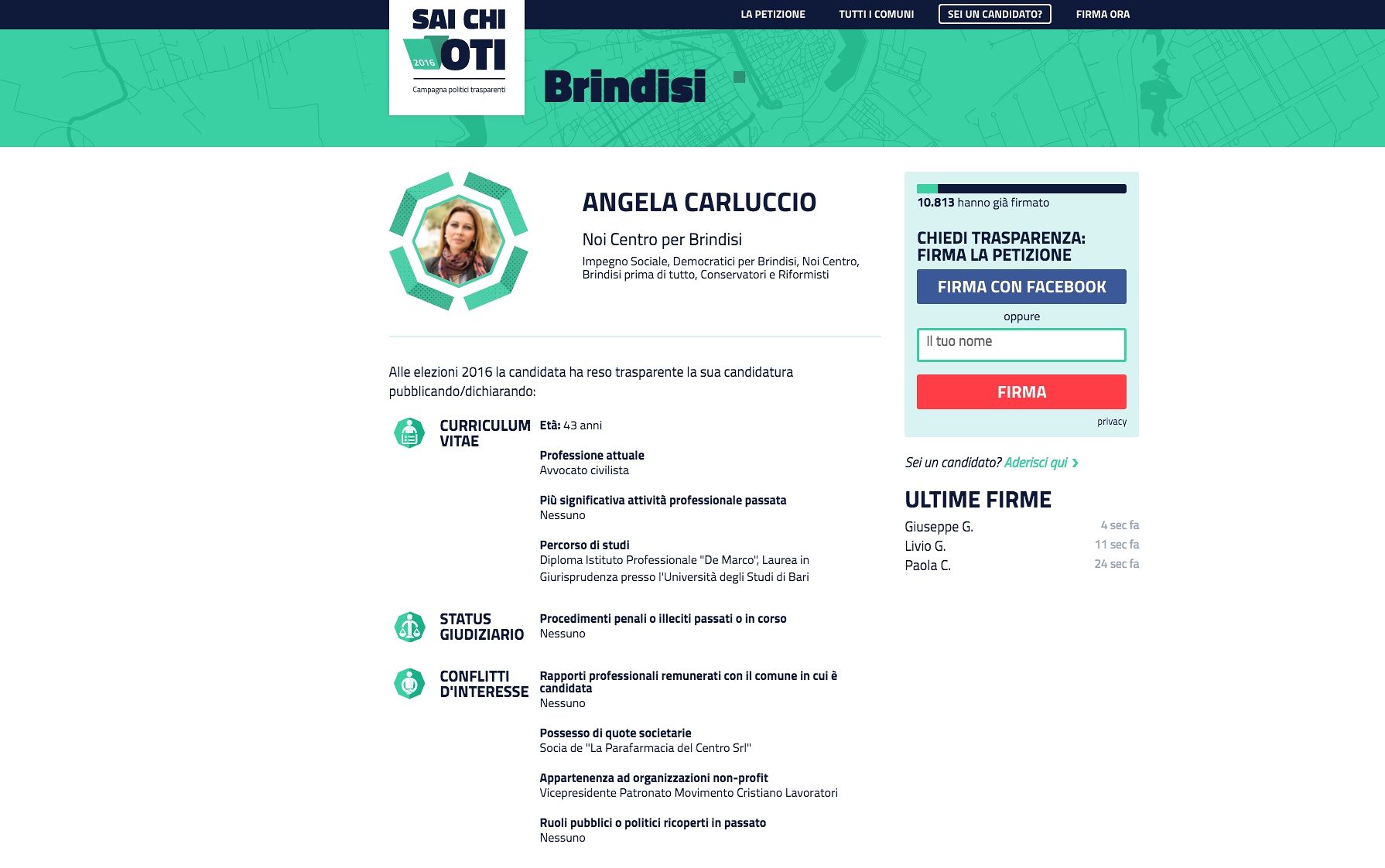 Così come aveva annunciato qualche giorno fa, Angela Carluccio, candidata sindaco a Brindisi per la Grande coalizione di Centro, ha aderito alla campagna nazionale di trasparenza “Sai chi voti” ed è oggi uno dei primi candidati in Italia (e unico a Brindisi) a comparire sul sito che punta a contrastare il malaffare e ripristinare un legame di fiducia tra i cittadini e le istituzioni.