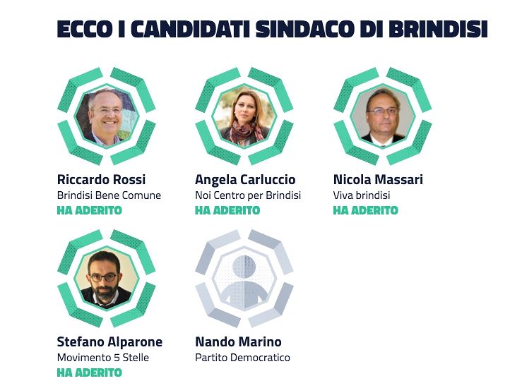 A Brindisi la prima ad aderire alla campagna è stata Angela Carluccio, seguita da Riccardo Rossi, Stefano Alparone e Nicola Massari. Non hanno aderito alla campagna di trasparenza i candidati Nando Marino e Simona Pino D’Astore.
