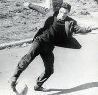 Nella foto una famosa immagine di Pasolini che, pur vestito di tutto punto, con abito scuro, cravatta e pullover sotto la giacca, in una bella giornata di sole, non resiste alla tentazione di tirare due calci per strada (anche in bello stile…).