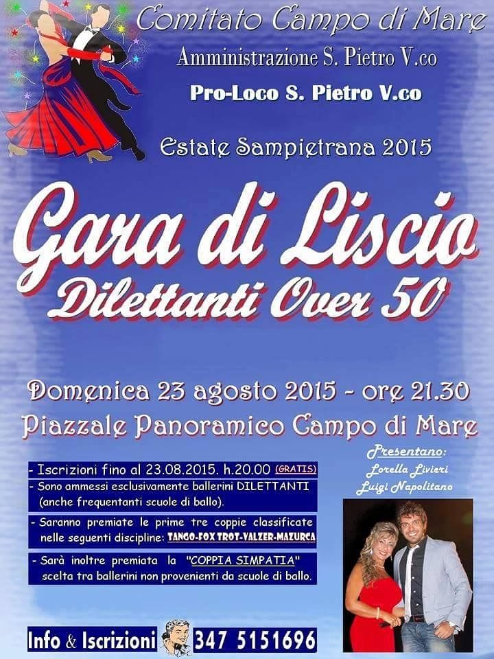 Domenica 23 agosto alle 21.30 sul piazzale panoramico di Campo di Mare, (marina di San Pietro Vernotico), nell’ambito del cartellone estivo 2015, si svolgerà una serata dedicata al liscio, con una competizione riservata a ballerini amatoriali over 50. Una giuria tecnica selezionerà le tre coppie vincitrici che si esibiranno in Tango, Fox Trot, Mazurka e Valzer. È previsto anche un premio speciale per la “Coppia simpatia” per ballerini che non abbiano mai frequentato scuole di ballo. Durante la serata ci saranno anche momenti danzanti per il pubblico. Le iscrizioni sono gratuite e aperte fino al 23 agosto. I ballerini in gara dovranno presentarsi almeno 30 minuti prima dell’inizio. Per Info e iscrizioni chiamare il 3475151696.