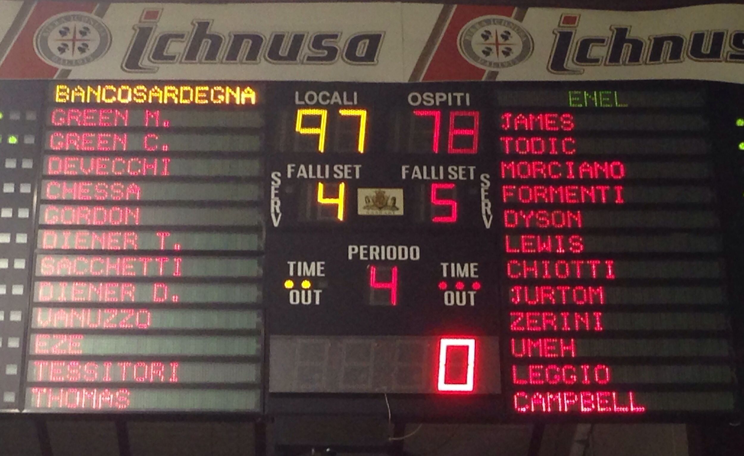 Banco di Sardegna Sassari: Green M. 6, Green C. 28, Devecchi 2, Chessa n.e., Gordon 6, Diener T. 7, Sacchetti B. 6, Diener D. 18, Vanuzzo 3, Eze, Tessitori n.e., Thomas 21. All. Sacchetti.