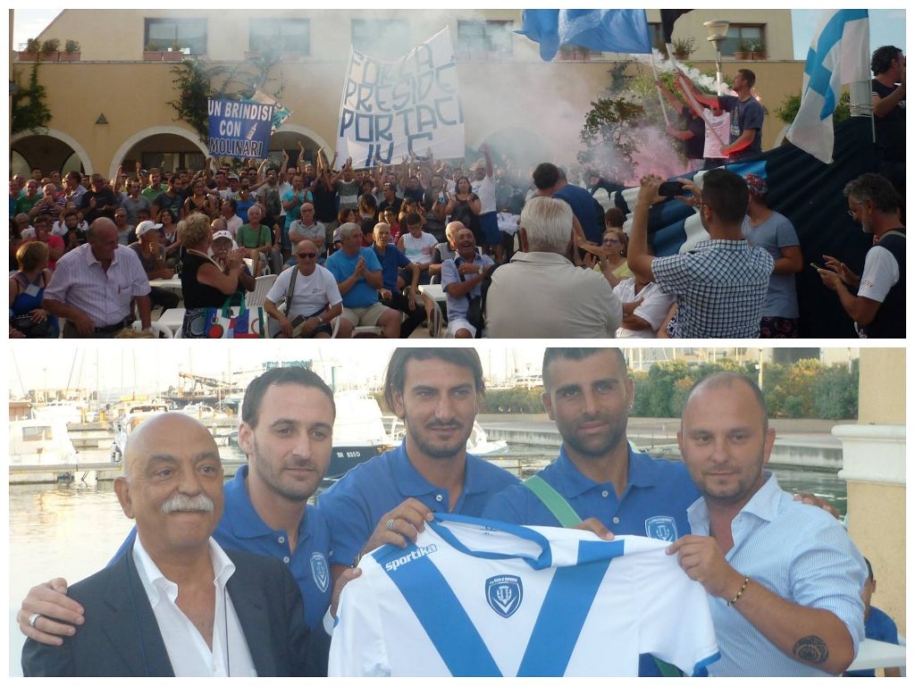 Clima da stadio ed adrenalina a mille al porticciolo turistico “Marina di Brindisi” in occasione della presentazione dei primi pezzi pregiati del Brindisi Calcio edizione 2014/15. in un crescendo di entusiasmo il Presidente Antonio Flora, affiancato dal figlio Giorgio, ha prima ringraziato quanti, tifosi, esponenti delle istituzioni e dell’imprenditoria, sono stati vicini alla società in questo momento iniziale della stagione e poi, quando nell’illustrare i programmi della società, ha detto ai tantissimi tifosi presenti, almeno 400 e con al seguito bandiere, striscioni e variopinti fumogeni, che il coro che vuole sentire dall’inizio fino alla fine del campionato è quello che fa: “la capolista se ne va…” un boato si è alzato in cielo, un urlo liberatorio perchè è esattamente quello che volevano sentire i tifosi biancazzurri per bocca del presidente che,m cioè, il Brindisi mira senza se e senza ma a vincere il campionato e ritornare fra i professionisti.