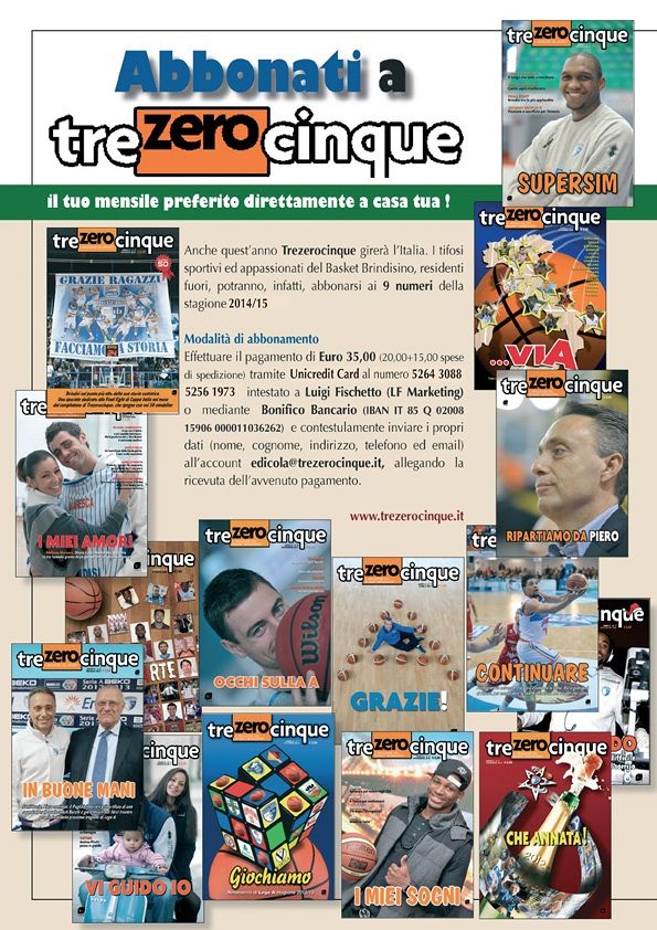 Anche quest’anno Trezerocinque continuerà a girare l’Italia. I tifosi sportivi ed appassionati del Basket Brindisino, residenti fuori, potranno, infatti, abbonarsi ai 9 numeri della stagione 2014/2015: il primo numero sarà in edicola da Sabato 11 Ottobre pv, alla vigilia dell’esordio casalingo contro Pesaro.