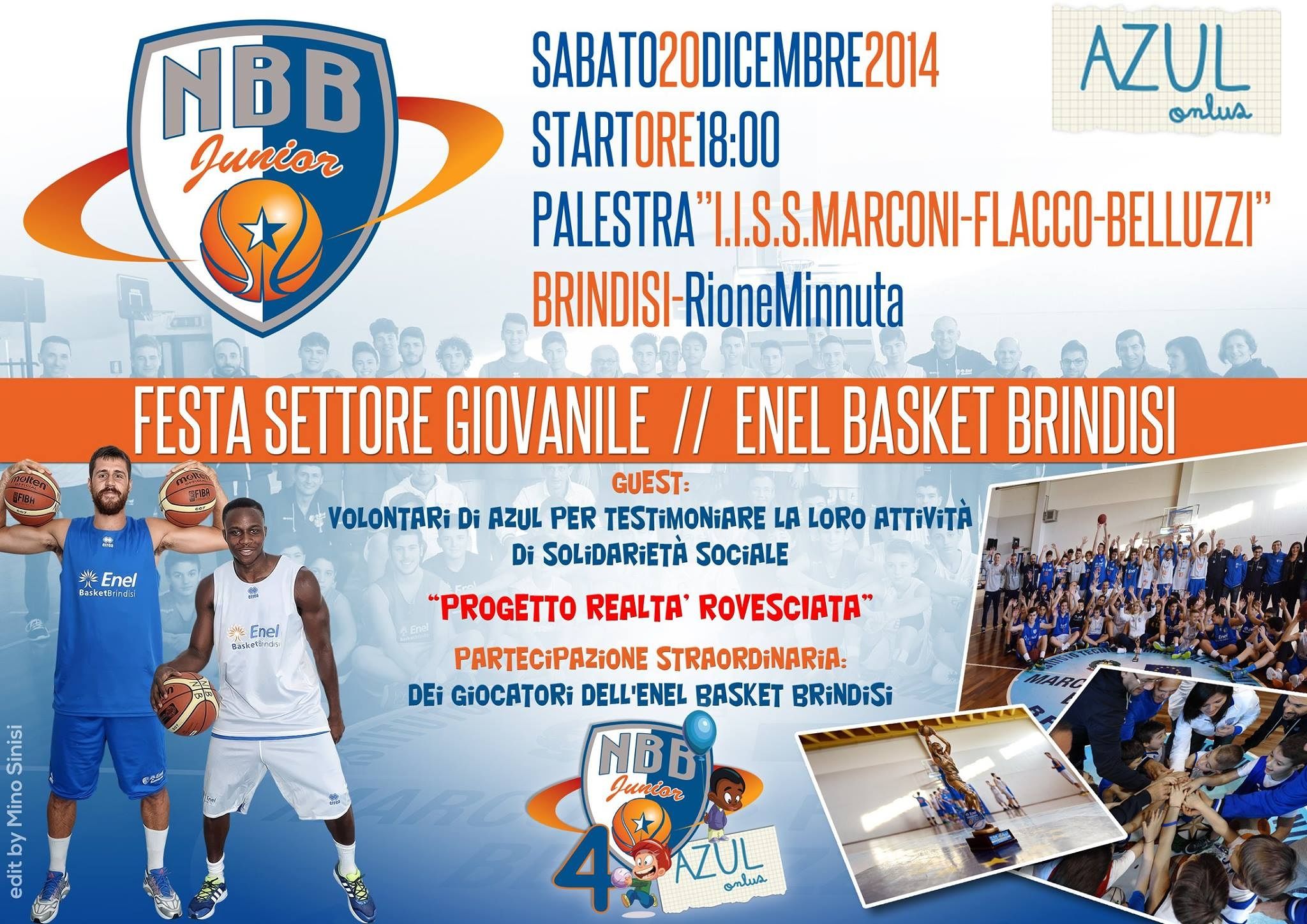 Questo pomeriggio start ore 18 presso la palestra dell’Istituto Marconi-Flacco-Belluzzi al rione Minnuta con la “Festa del settore giovanile ed Enel Basket Brindisi”: interverranno i volontari di Azul Vanda Gatti, di Brindisi, e Angelo Urgo, di Gravina di Puglia, per testimoniare anche supportati da immagini e video la loro attività di solidarietà sociale.