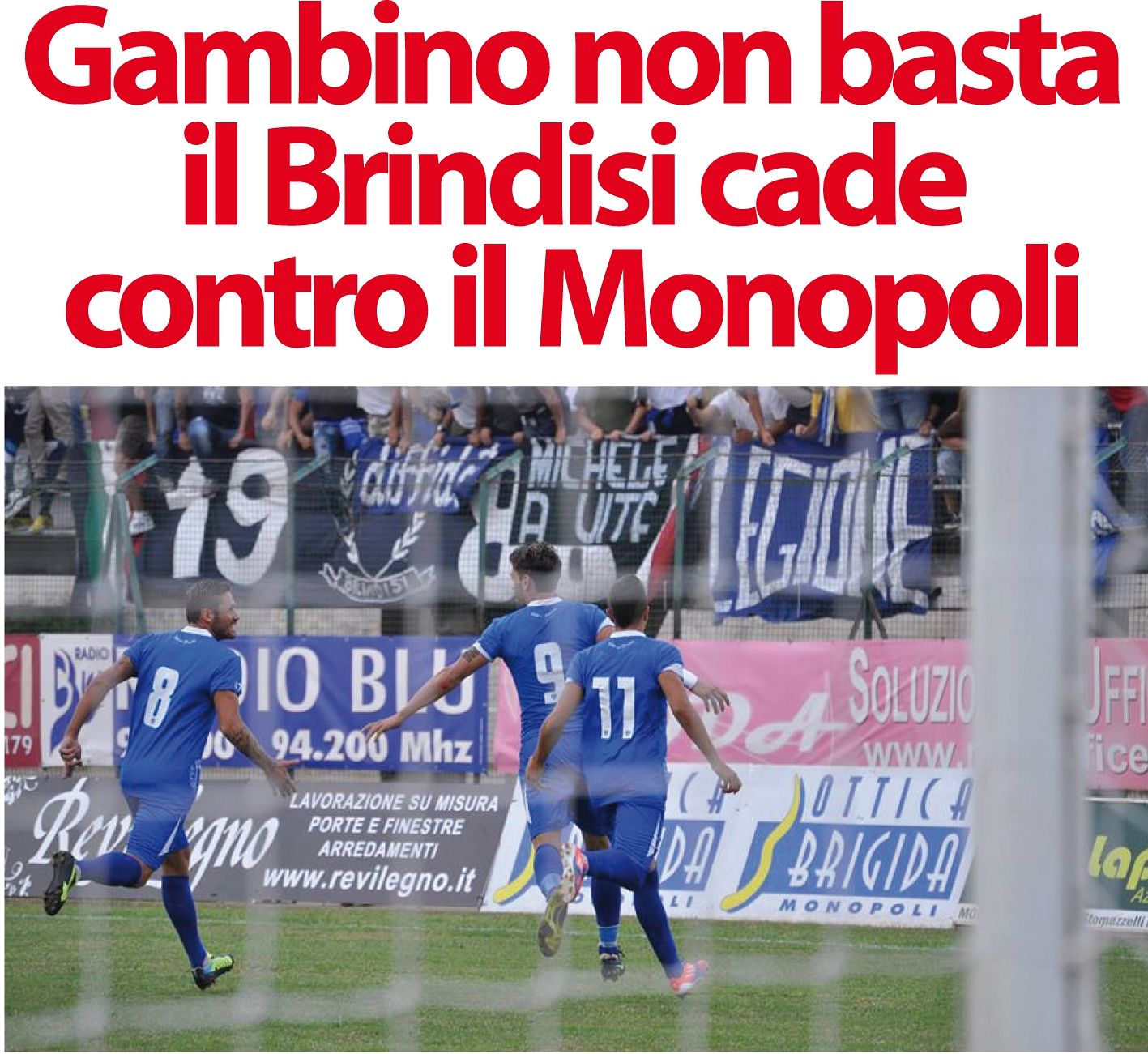 La verve offensiva di bomber Gambino, autore di altre due reti e di una prestazione maiuscola, non è sufficiente a controbilanciare le gravi defaiances dell’intero reparto arretrato brindisino e la poca lucidità del comparto di centrocampo ed allora il 3 a 2 finale anche se ingiusto per la mole di gioco mossa dai biancazzurri, tradottasi in uno sterile possesso palla, deve essere accettata come una salutare lezione che deve servire per il futuro a far capire ai calciatori che quest’anno vestono la maglia con la V che in serie D è molto più proficuo giocare con la clava piuttosto che con il fioretto.