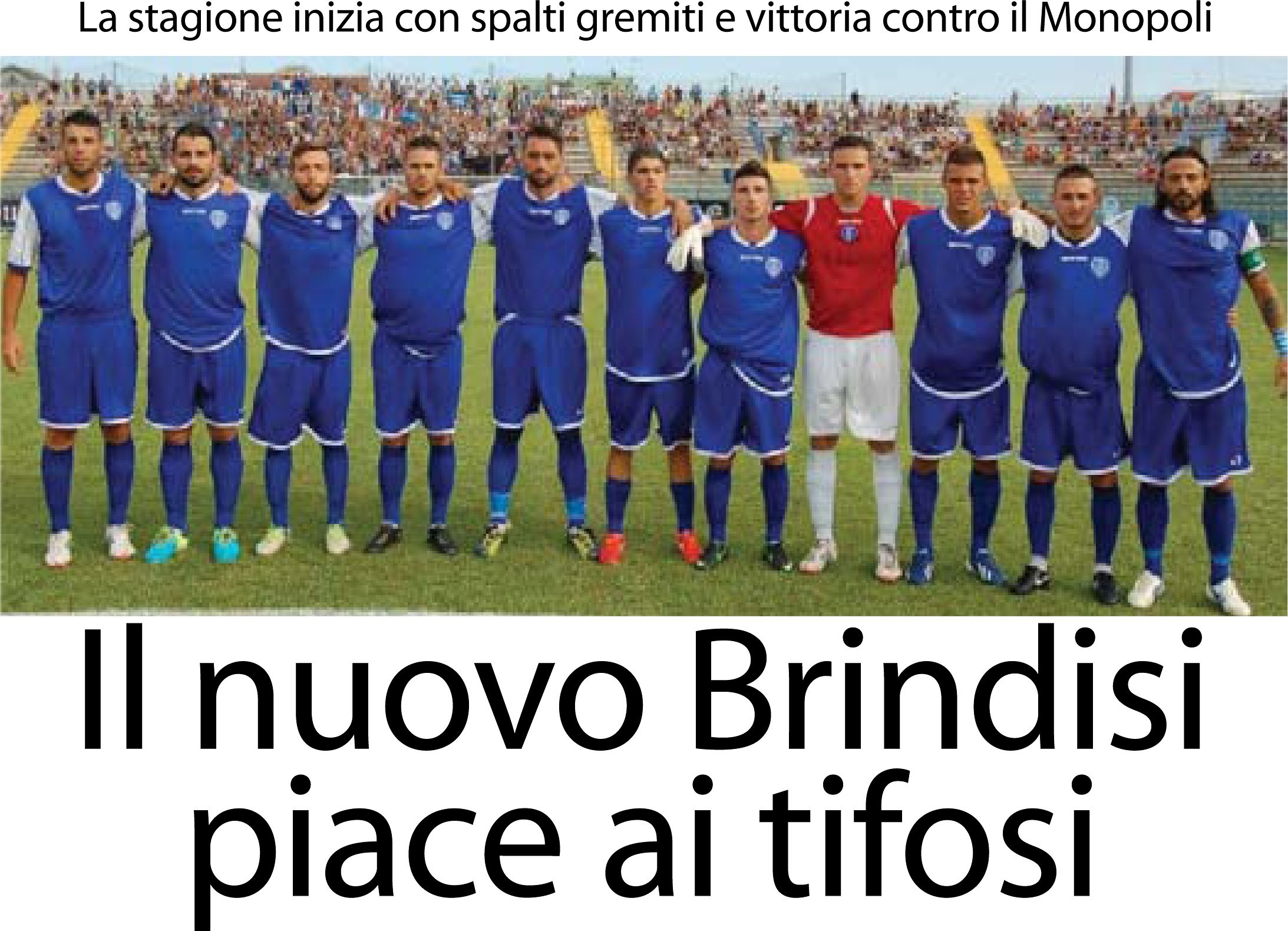 Le attese, almeno per ciò che concerne il pubblico di fede biancazzurra, non sono andate deluse ed il Brindisi non ha steccato la sua prima gare ufficiale e, vincendo per 2 a 1, ha eliminato dalla Coppa Italia il Monopoli in una gara in cui si è già respirato il clima campionato. I numerosi spettatori che hanno affollato specialmente le due curve contrapposte hanno gradito lo spirito agonistico che ha pervaso tutti e 22 i contendenti anche se a gioire, al triplice fischio, è stata una parte soltanto. Veniamo, brevemente, alla cronaca della partita Nei primi venti minuti del match le due squadre si sono studiate; il primo vero affondo è di marca monopolitana e lo porta l’ex capitano biancazzurro Mimmo Laboragine, ora in maglia biancoverde, con un potente tiro dalla distanza che si stampa violentemente sulla traversa: nell’occasione il giovane portiere brindisino Peschechera, classe 1994, che è stato preferito al più espero Cristiano Novembre in ossequio alla regola degli under, è apparso immobile. Il campanello d’allarme non viene colto e, pochi minuti dopo, è ancora una volta Laboragine a tirare in diagonale da dentro l’area e far secco Peschechera per il vantaggio ospite. L’ex capitano del Brindisi, dimentico dei suo recenti trascorsi, esulta visivamente sia sotto la curva ospite che all’indirizzo della tribuna coperta, guadagnandosi i fischi ed i rimbrotti risentiti dei suoi ex tifosi. La reazione dei padroni di casa non si fa attendere e dopo appena una manciata di minuti, alla mezzora, Giuseppe Gambino beffa il portiere Mirarco con un colpo di testa ad altezza astrale che toglie letteralmente dalle mani dell’estremo difensore avversario la sfera indirizzandola in porta per la gioia dei tifosi biancazzurri. Si va negli spogliatoi sul risultato di parità sostanzialmente giusto Nella prima parte della ripresa è il Monopoli a menar le danze e dopo appena cento secondi l’attaccante sudamericano Di Rito centra in pieno il legno a portiere, ancora una volta, immobile. Successivamente viene colpito anche un terzo legno, ma la rete non sarebbe stata valida per una segnalazione di fuori gioco recepita dall’arbitro. Questa volta lo scampato pericolo sveglia il Brindisi dal torpore catalettico in cui si trovava e Loiodice, autore di una buona prova, prova la conclusione dal limite, sfiorando di pochissimo il montante alla sinistra di Mirarco. Il Monopoli, più a corto di preparazione del Monopoli, comincia ad arrancare e De Toma non ce la fa più a contenere lecitamente la verve di Gambino ed è costretto ad un fallaccio, al limite dell’area, che viene giustamente sanzionato con l’espulsione e la punizione. Mentre tutti si aspettavano Saverio Pellecchia sul pallone, si incarica del tiro l’altro centrocampista, Marsili, che con una splendida conclusione centra in pieno la traversa. Con gli ospiti in affanno ed in inferiorità numerica si aprono delle autostrade per Tedesco e compagni ed è ancora una volta Gambino, volando fino al cielo, a colpire di testa una sfera invitante crossata da Loiodice ed a far secco per la seconda volta il portiere avversario portando in vantaggio il Brindisi. A pochi minuti dal termine I padroni di casa vanno in gol anche con capitan Tedesco, ma la bandierina alzata del guardalinee ne strozza in gola il suo urlo di gioia. Al triplice fischio il Fanuzzi, ad eccezione, ovviamente, della curva nord invasa dai monopolitani, esplode in una gran festa e, dopo i saluti a centrocampo, la squadra può correre sotto la Curva Sud ad abbracciare, idealmente, tutti i brindisini.