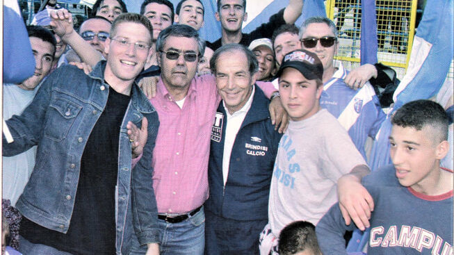 Nel corso di una affollatissima conferenza presso la Biblioteca Provinciale, alla presenza di tutte le autorità sia civili che religiose, presentò alla città il suo progetto per riportare il Brindisi non in C2, non in C1, ma in B, in A e poi in Europa nel volgere di pochi anni, provocando il delirio della folla.