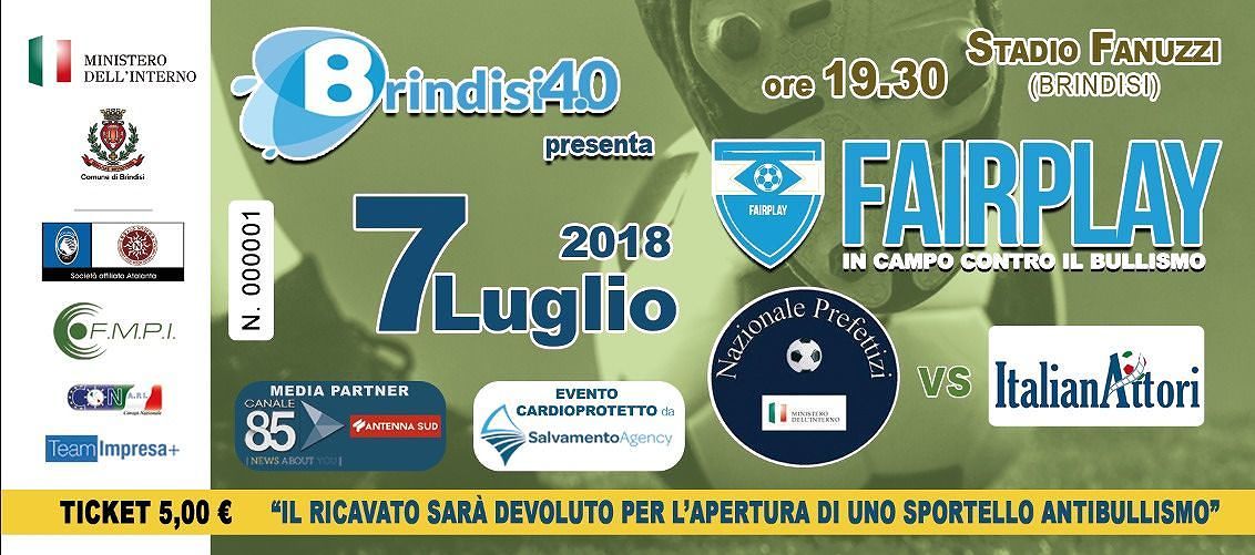 Sarà il noto attore pugliese Paolo Sassanelli, giovedì 5 luglio 2018 nella sala Conferenze della Prefettura di Brindisi a partire dalle 11:30, a presenziare alla presentazione ufficiale alla stampa di “Fairplay, in campo contro il bullismo”, sfida di calcio a sfondo benefico tra la ItalianAttori, di cui fa parte l’artista, e la Nazionale Prefettizi, il nuovo grande evento targato Brindisi 4.0 previsto sabato 7 luglio, presso lo stadio comunale “Franco Fanuzzi”.