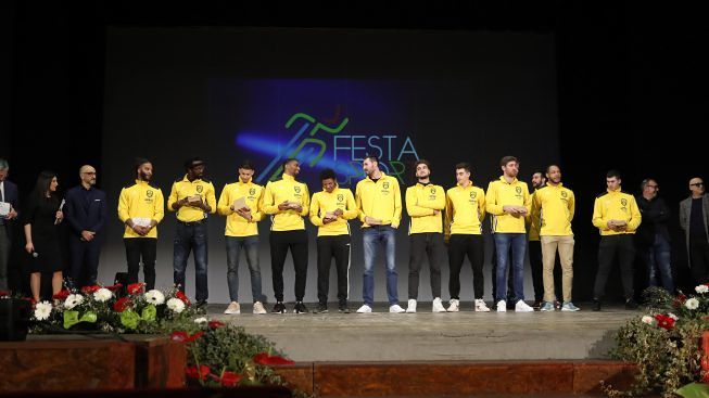 Alle 20,30 in punto il buio è calato in sala e si è fermato il mondo: sulle note di una canzone dei Queen ha fatto il suo ingresso in teatro da un accesso laterale, salendo direttamente sul palco, l’Happy Casa Brindisi al gran completo: staff tecnico ed atleti, compreso Riccardo Moraschini, appena rientrato a Brindisi dopo una gara disputata in Lituania con la maglia della Nazionale Italiana. Scroscianti applausi oltre che per il giocatore azzurro e per l’allenatore Frank Vitucci, anche per il capitano Adrian Banks e per il simpaticissimo John Brown III che non ha smesso un attimo di scherzare coi compagni.