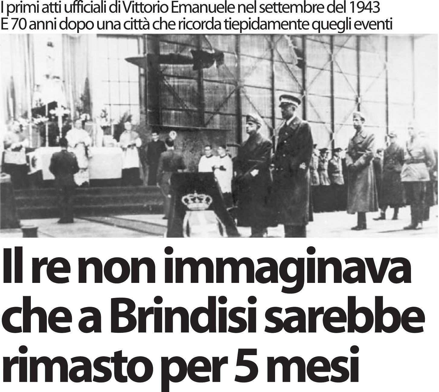 12 settembre 1943. Con l’arrivo del re, del presidente del consiglio, di parte del governo e di buona parte del comando delle forze armate, Brindisi, è chiamata a rivestire il ruolo di Capitale. Al momento del proclama alla nazione, l’11 settembre, il re non sa neppure quanto tempo resterà nell’ammiragliato di Brindisi e nella formula sibillina del comunicato egli non cita il nome della città messapica, vuoi per paura di rappresaglie, vuoi perché ancora non sa che vi rimarrà ben 5 mesi.
