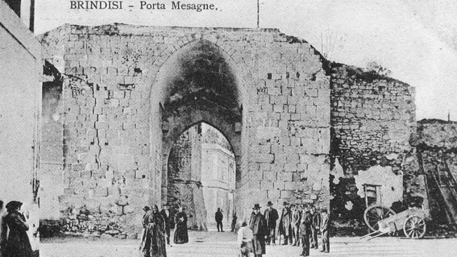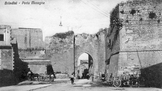 La sorte dell’antica Porta Mesagne, deteriorata dall’incuria e dal tempo, sembrava ormai segnata. Il decreto di demolizione stava per essere eseguito la mattina del 31 ottobre del 1925, ma gli operai non riuscirono a dare inizio ai lavori poiché trovarono collocato sotto l’arcata del monumento il noto canonico Pasquale Camassa, irremovibile e determinato nel proposito di impedire l’abbattimento. Il clamoroso gesto del noto filantropo e storico brindisino, troppo spesso dimenticato nonostante i suoi numerosi e notevoli impegni a favore della cultura e la salvaguardia delle tradizioni e dei monumenti cittadini, procrastinò la scellerata decisione, tramutata poi – fortunatamente – nel consolidamento e restauro conservativo della più antica porta di accesso alla città.