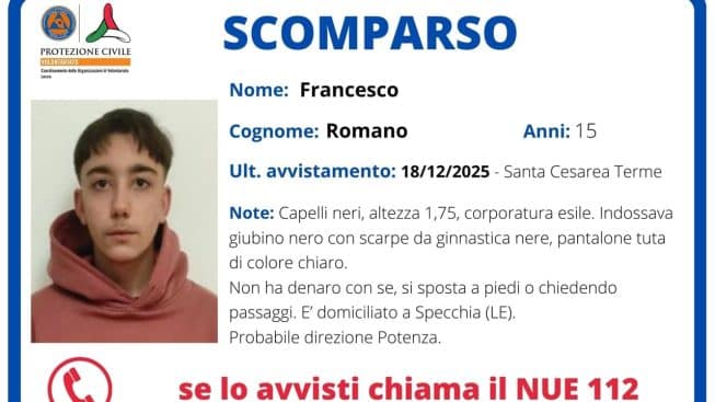 APERTURA / 19 Dicembre 2025 Ore di apprensione a Specchia: scomparso un ragazzo di quindici anni Si sono perse le tracce di Francesco Romano, un ragazzo di 15 anni domiciliato a Specchia, visto per l’ultim...